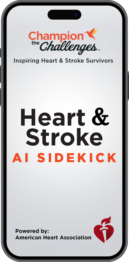 - Education and Lifestyle Coaching: Using AHA’s educational resources, the Champion the Heart and Stroke Sidekick provides bite-sized, easy-to-understand information on managing risk factors like hypertension, diabetes, or smoking. It offers daily tips, such as AHA’s “Life’s Essential 8” for cardiovascular health, and answers questions like “How do I reduce my cholesterol?” with evidence-based responses. Sharing stories of other survivors offers that heartfelt understanding that you are not alone.