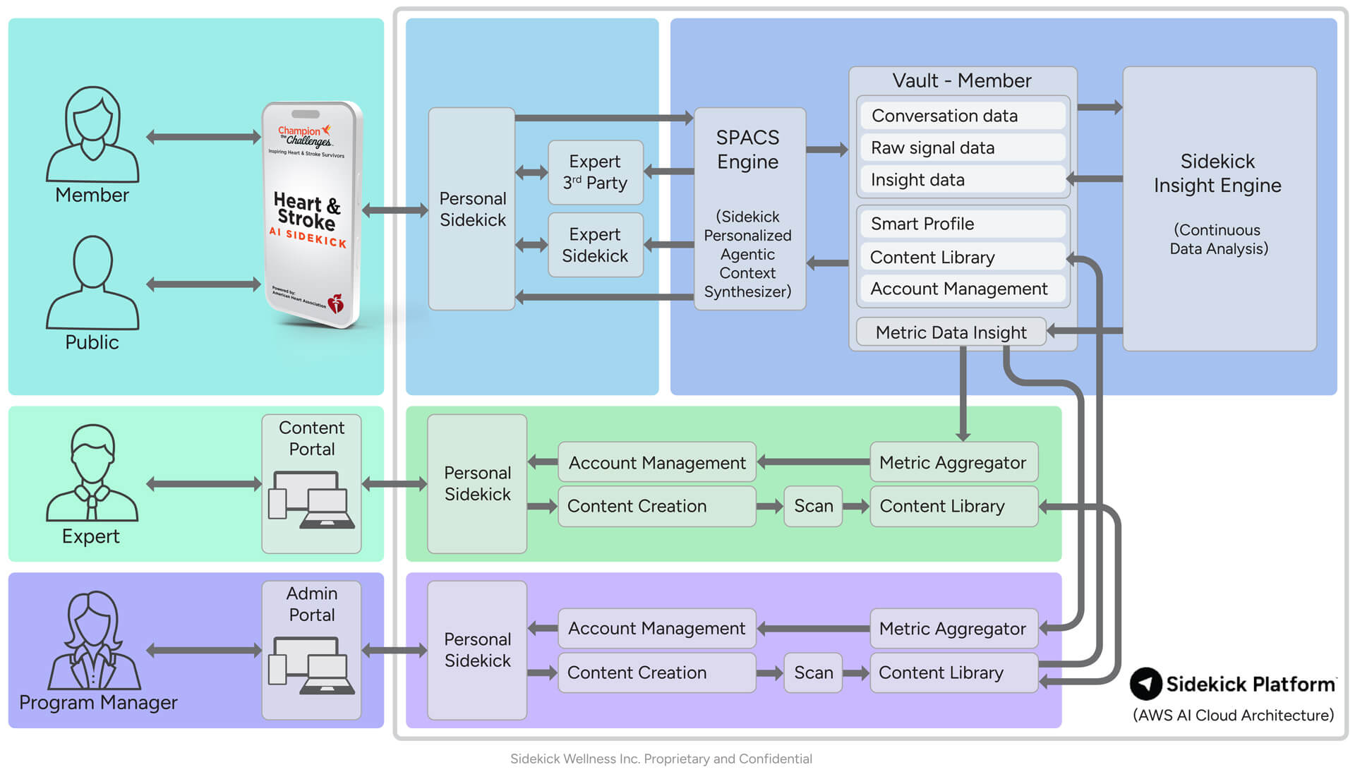 The architecture of Sidekick™ platform provides the infrastructure for experts and organizations to scale their expertise while retaining full ownership of their IP and audience relationships. It is designed to support organizations and their experts as they convert specialized knowledge into conversational AI agents that provide instant, personalized guidance globally, 24/7, without requiring coding resources. This architecture ensures “Human-in-the-Loop” by default, guaranteeing the accuracy and provenance required of experts and their organizations.